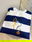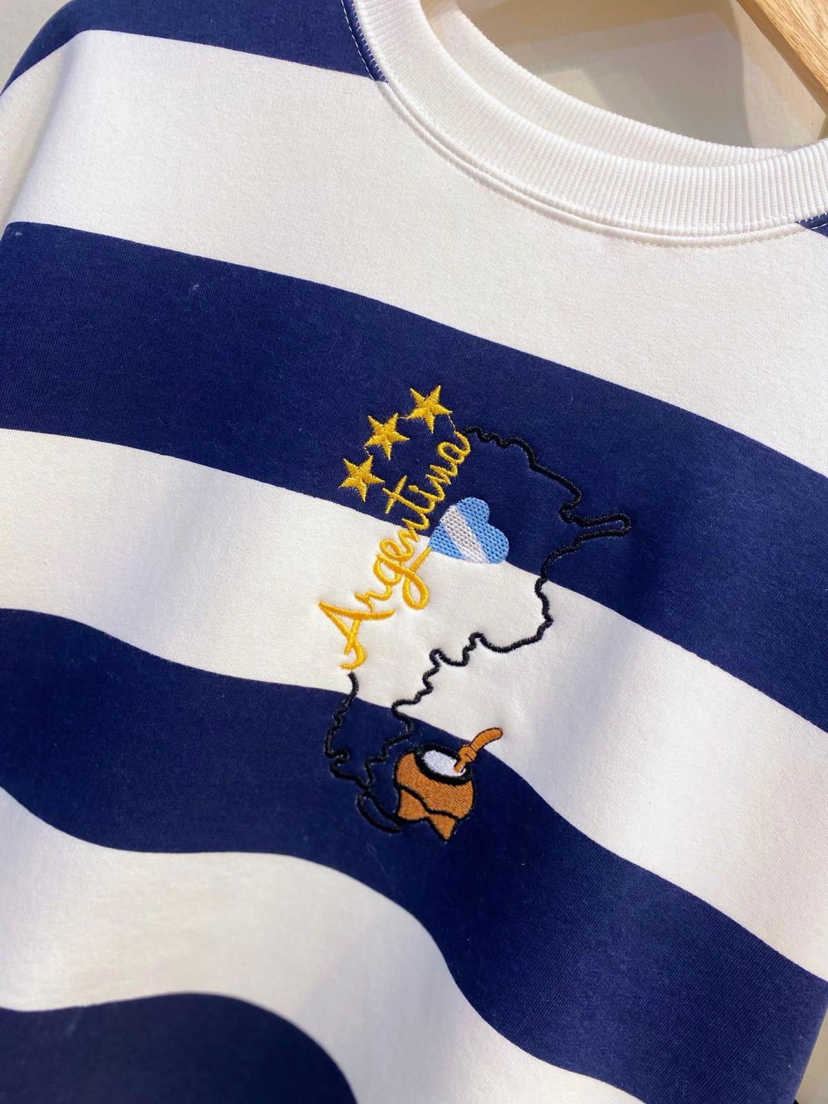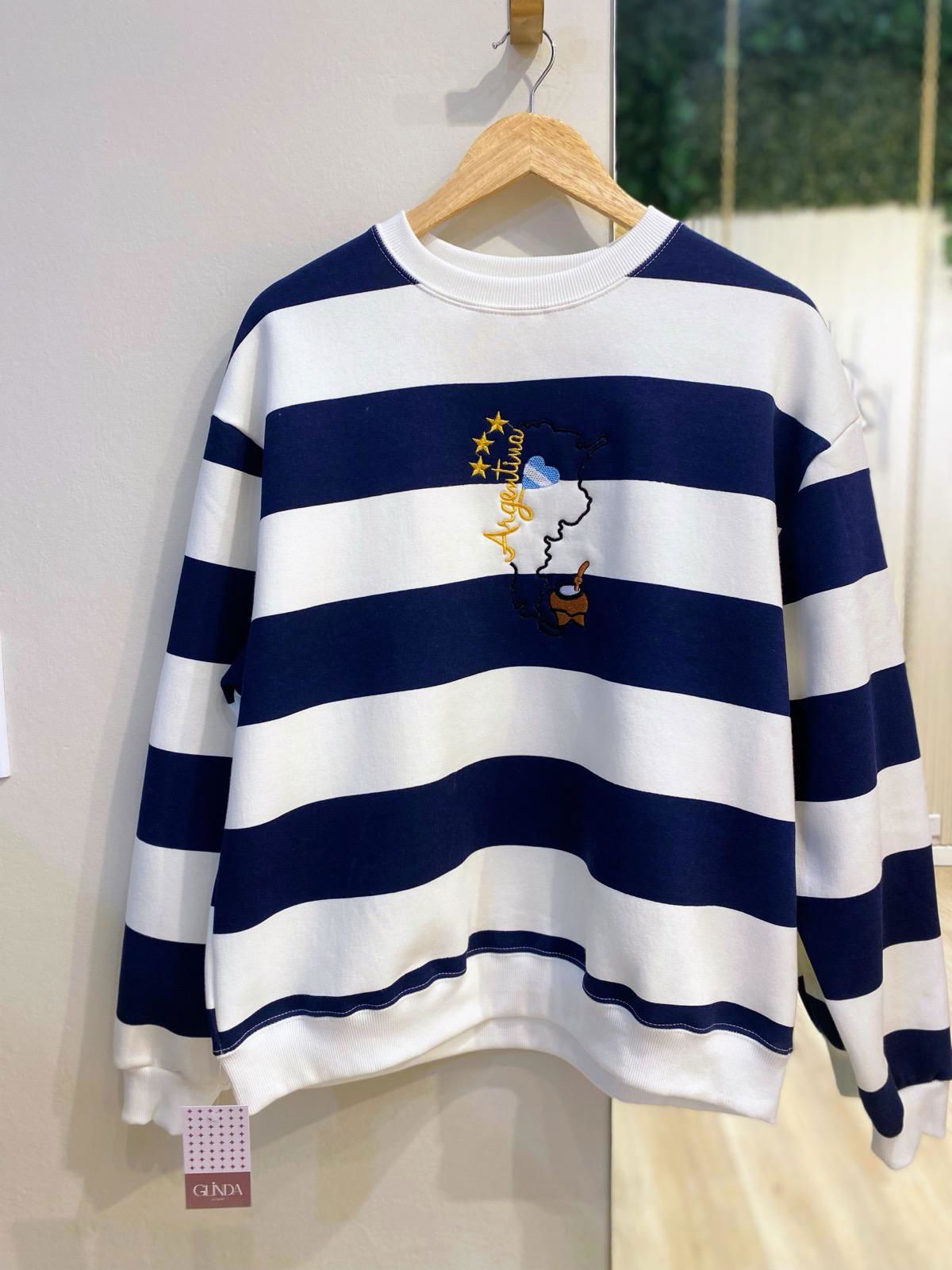 Buzo frizado premium, rayado azul y blanco.
