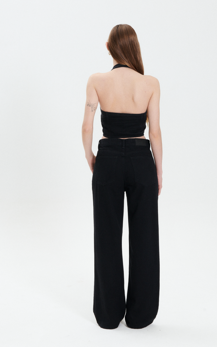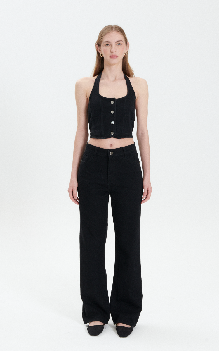 Jean recto denim rígido. Tiro alto. 5 bolsillos. Color negro.